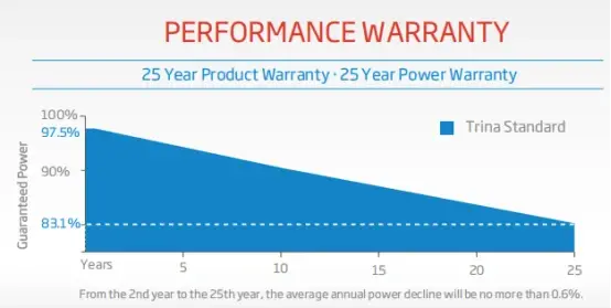 The 25-year power warranty ensures ≤0.6% annual degradation. If not met, Trina provides free repairs/replacements, avoiding extra costs.